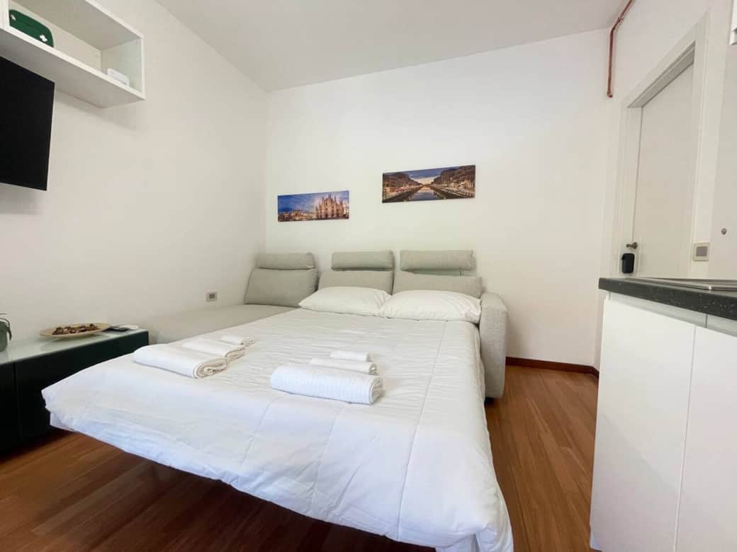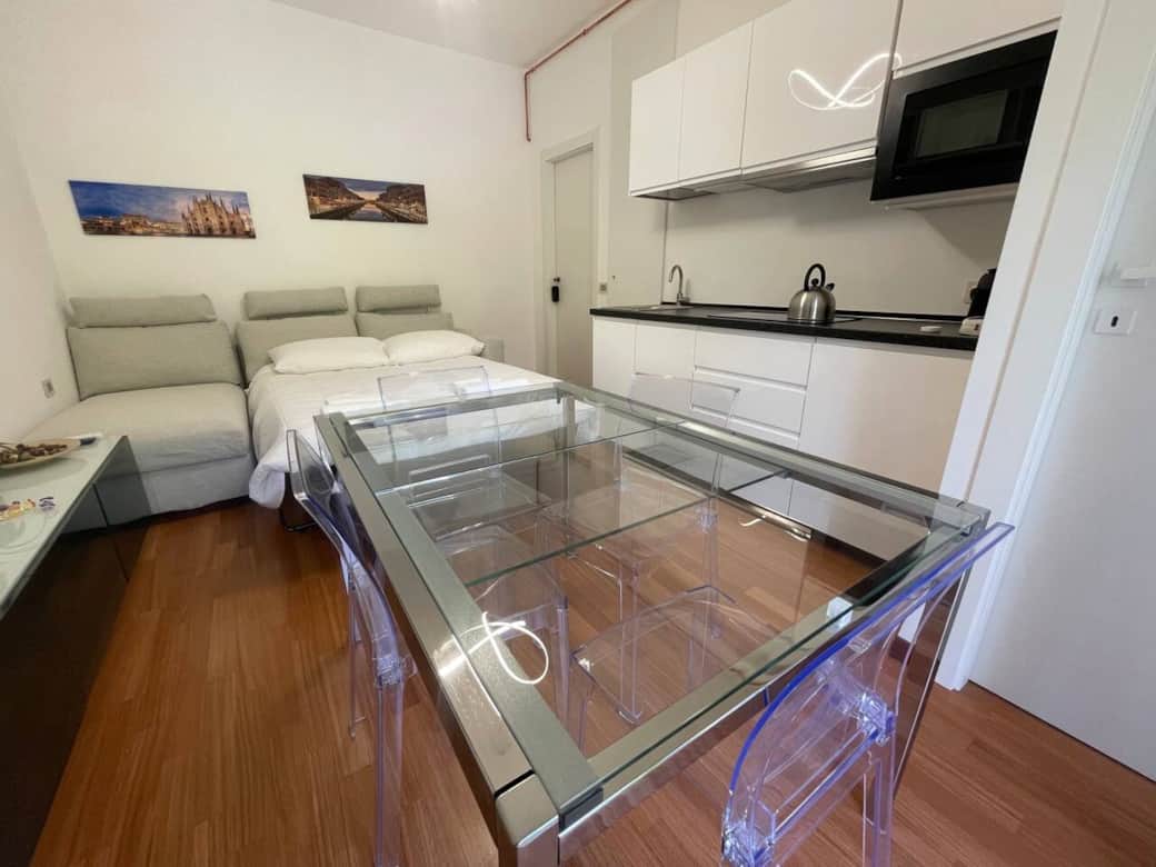 Monolocale luminoso e accogliente, con comodo divano letto matrimoniale, balcone privato con tavolino per due e sauna a infrarossi monoposto, ideale per rilassarsi dopo una giornata in città . Situato di fronte alla fermata del tram 14, che porta al Duomo, e a 5 minuti dalla metro blu Tolstoj, collegata a Linate. A due passi dalla zona Tortona, cuore del design, della moda e degli eventi del Fuorisalone.